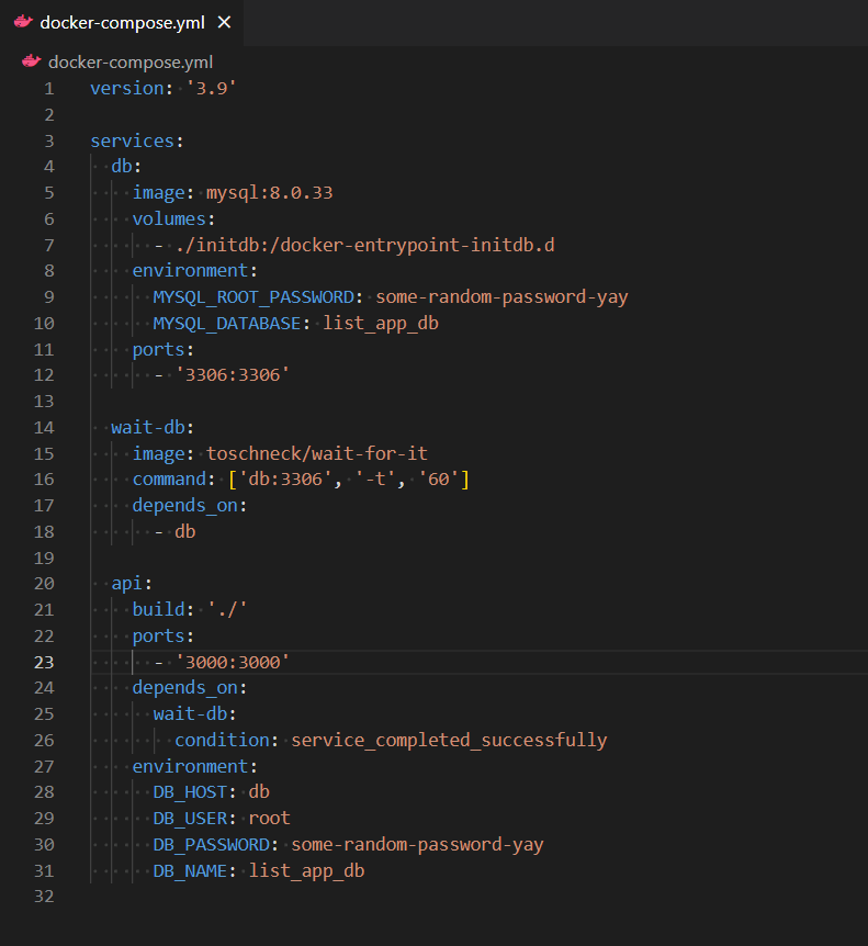 services とは起動したいコンテナ達のことであり、今回はdb(mySQLのコンテナ)、wait-db、api(サーバーのコンテナ)の3つです。