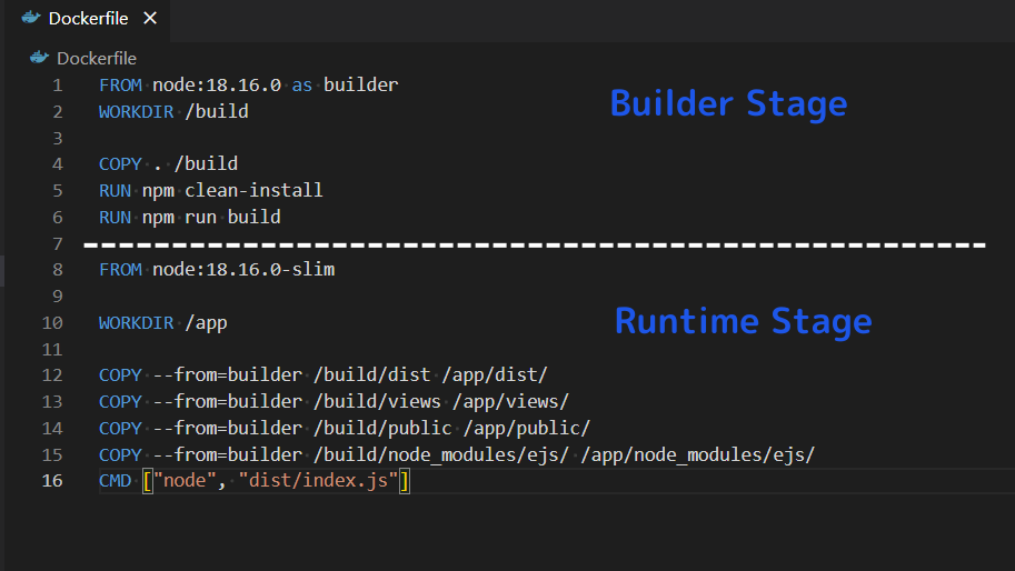 Runtime Stage ではnode:18.16.0-slim と指定することで、実行環境用の軽量なイメージを使用しています。
