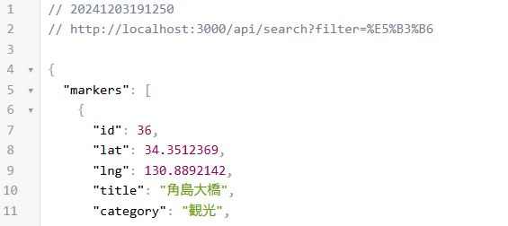 }ブラウザのurlに「http://localhost:3000/api/search?filter=島」のように入力すると、下記のように検索結果のレスポンスが返ってくるようになります。